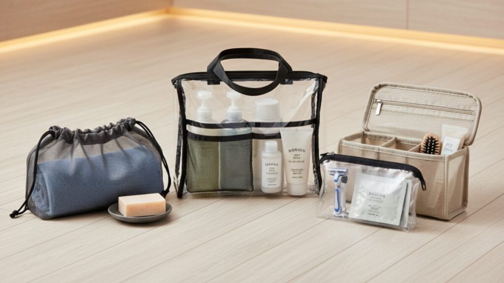 • 洗浄用品: シャンプー、コンディショナー、石鹸(またはボディソープ)、洗顔料。備え付けがない前提で、旅行用の小さいボトルや1回分の使い切りパックがかさばらず便利です。