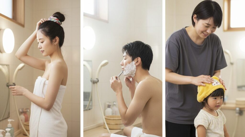 浴槽(湯船)の近くや、脱衣所で行うのは衛生上の観点からも重大なマナー違反です 。洗い場で、鏡の前に座って、周りに飛び散らないよう配慮しながら行いましょう。