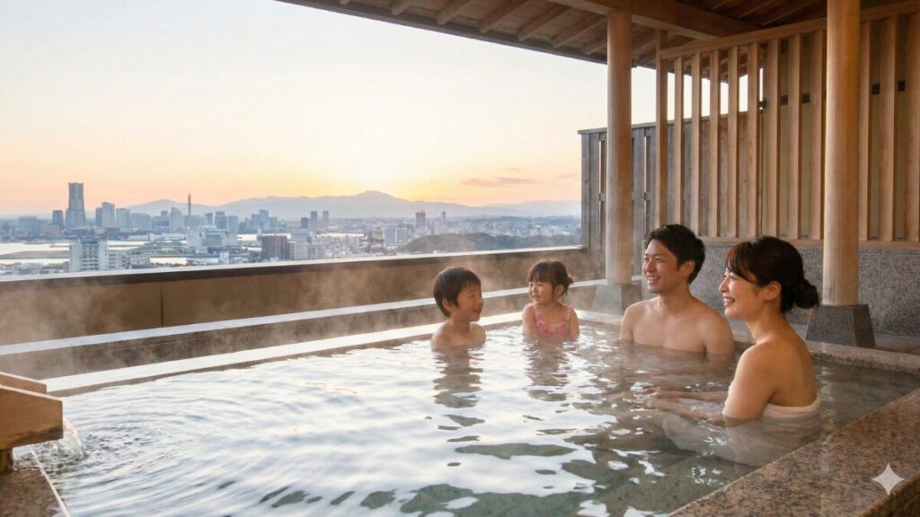 みなとみらいという絶好のロケーションにあり、都会にいながら本格的な温泉を楽しめる施設です。熱海と湯河原の源泉を毎日タンクローリーで運んでおり、泉質の良さも評判です。屋上の展望足湯庭園からは、横浜の夜景を一望でき、子どもも大人も特別な時間を過ごせます。館内には広々としたキッズランドやゲームコーナーも完備されており、まさに一日中遊べる都市型温泉テーマパークと言えるでしょう。