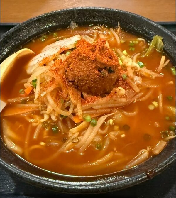 イチオシメニューになっていた「辛赤富士ラーメン」は豆板醤のような味で激辛でした。