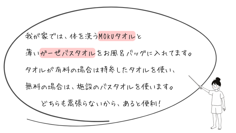 - タオルは荷物を減らしたいならレンタル、費用を抑えたいなら持参
