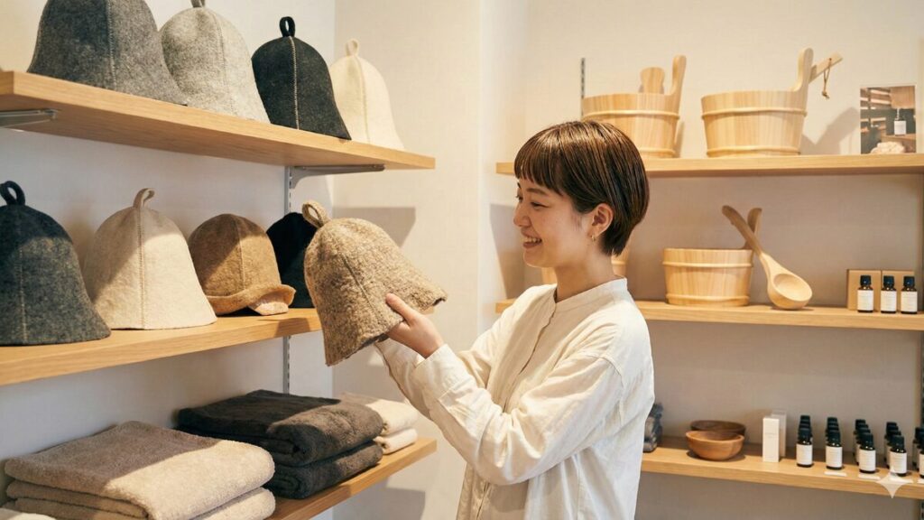 例えば、東京・表参道に店舗を構える「samomo」は、日本初のサウナグッズ専門店として大きな注目を集めています。ここはセレクトショップ形式をとっており、国内外から厳選された約20ものサウナ関連ブランドのアイテムが一堂に会します。ウール、リネン、タオル地など、様々な素材や形状のサウナハットを実際に手に取り、試着しながら比較検討できるのは、実店舗ならではの大きな魅力です。