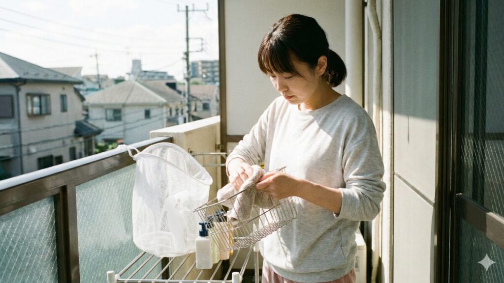 まず、全ての素材に共通する最も基本的な手入れは、**「使用後にしっかり乾かすこと」**です。銭湯から帰宅したら、カゴの中身をすべて取り出し、それぞれが重ならないように広げて、風通しの良い場所で本体と中身を完全に乾かしてください。これだけでもカビの発生をかなり抑制できます。