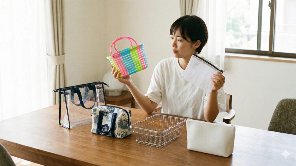 | ビニール | ・防水性が高く、中身が濡れにくい ・半透明など中身が見えにくいものもある ・デザイン性が高いものが多い | ・通気性が悪く、湿気がこもりやすい ・カビが発生しやすい ・熱に弱い場合がある | ・プールや海などでも使いたい人 ・濡れたものを分けて持ち運びたい人 |