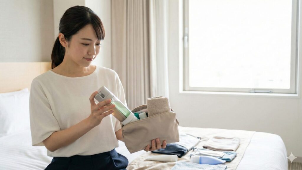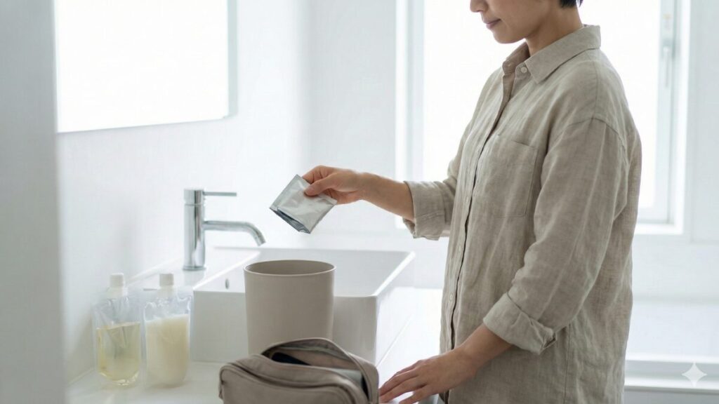 最大のメリットは、使い終わったら小さく折りたたんで捨てられることです。これにより、帰りの荷物がお土産などで増えても、ボトルのスペースを気にせず済みます。また、使い捨てにすることで、毎回清潔な容器を使用できるという衛生的な利点もあります。