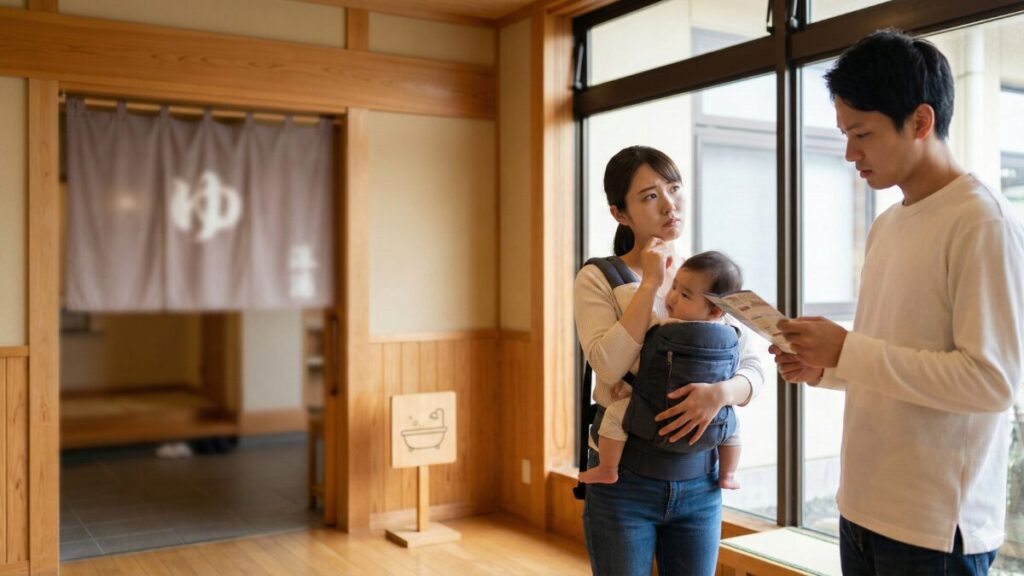 この場合、赤ちゃんは部屋のシャワー(もしあれば)以外で一切入浴できないことになります。これは「泊まれるスーパー銭湯」を期待する家族にとって、機能不全ですね。