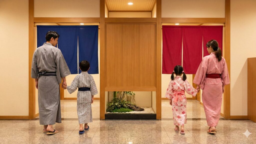 - 家族の分断:「女性専用エリア」 が用意されていることもありますが、これは裏を返せば「家族の分断」を意味します。例えば「父・母・息子」の家族で、お母さんが女性専用エリアに入ったら、お父さんと息子さんは別の場所。これでは「家族で泊まる」という目的が達成できません。
